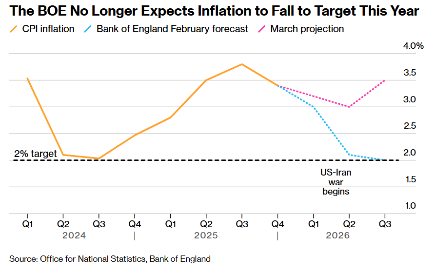 周三的数据表明,至少在伊朗战争爆发之前,通胀走势大体符合英国央行此前的乐观降温预期。英国央行原本预计通胀将在春季回落至约 2%的长期锚定目标水平,但一旦能源市场陷入剧烈动荡,这一预测很快就变得彻底过时。