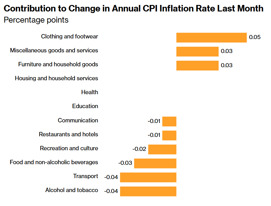 英国司机们需要在加油站支付的油价2月意外呈现出显著下跌了1.1%,而去年同期则上涨了1.5%。由于打折促销,英国国内的酒类价格更便宜,也产生了向下推动CPI的影响。服装和鞋类则推高了通胀,因为其价格意外上涨了0.6%,而2025年2月则下跌了 0.3%。上图为英国上月的年度CPI通胀率变化的贡献百分点基准。